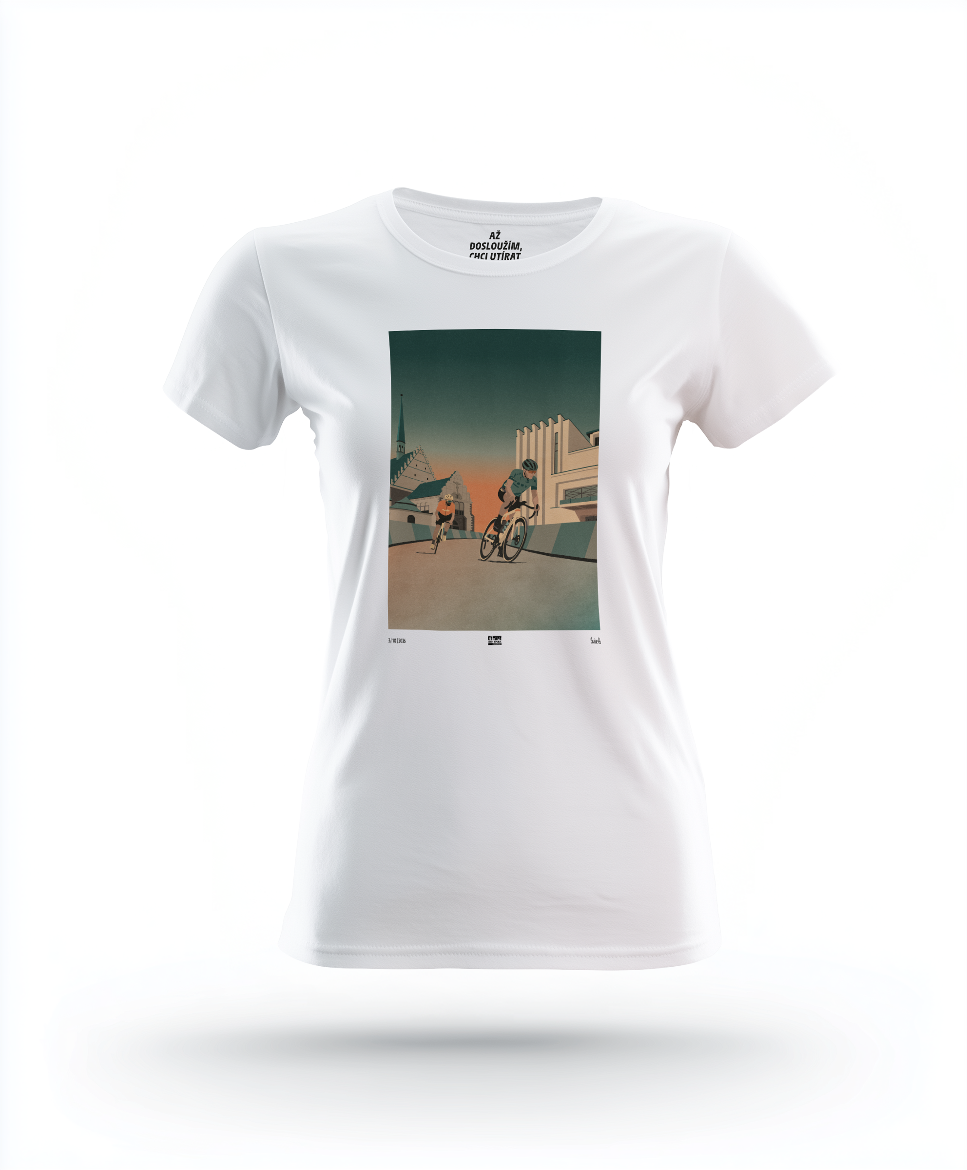 Kvalitní dámské triko s exkluzivní grafikou od vizuálního umělce grafika a ilustrátora Jana Šrámka, na které nechybí závodníci, Dům hudby a kostel svatého Bartoloměje v Pardubicích.