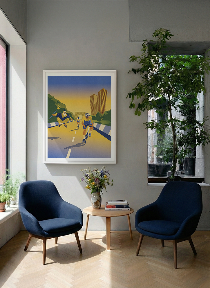 Originální plakát s exkluzivní grafikou od vizuálního umělce grafika a ilustrátora Jana Šrámka, na které nechybí závodníci v cílové rovince s ikonickým mrakodrapem V Tower a rezidencí Kavčí hory na pražském Pankráci.